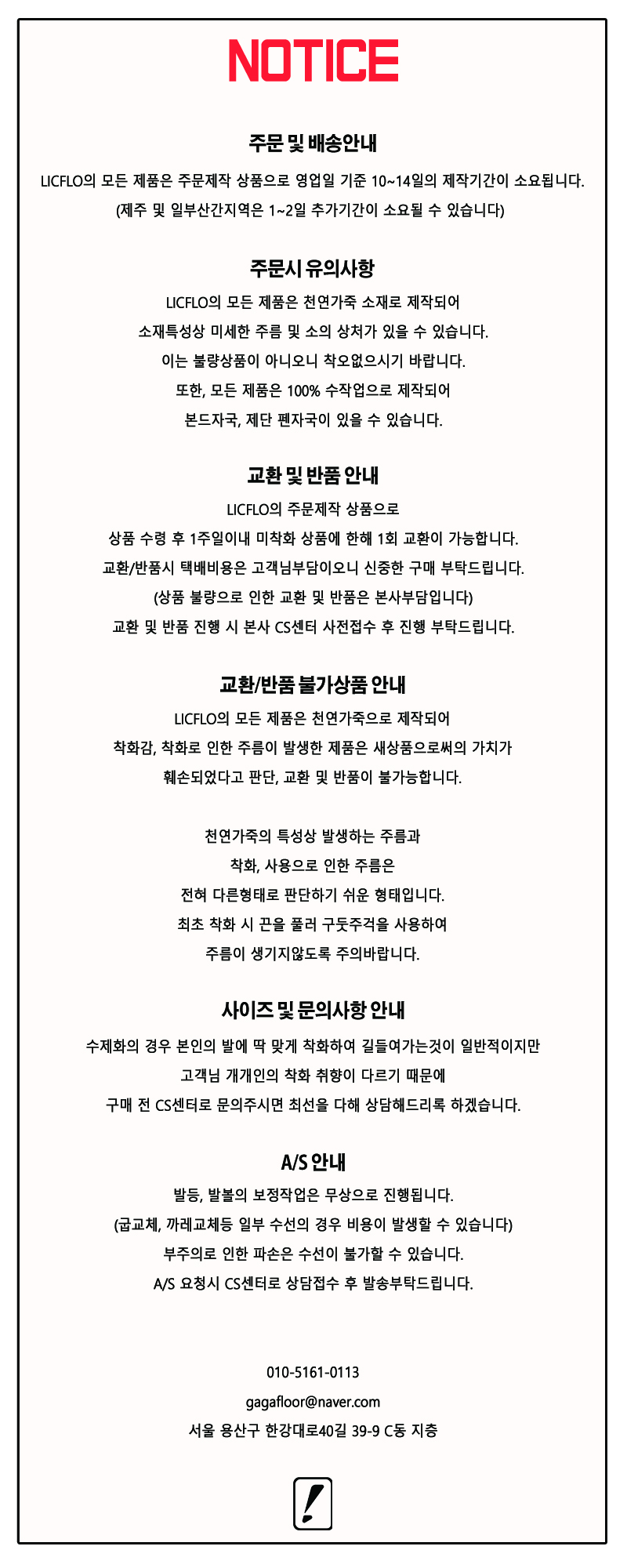 품질보증기간은 1년이며, 구매 후 재봉상태, 접착상태 불량등의 수선은 고객센터 접수 후 처리가능합니다. (바닥창, 인솔등 소모성자재의 경우 그 사유에 따라 유상으로 처리될 수 있으며, 사유에 따라 수선이 불가능할 수 있습니다.)